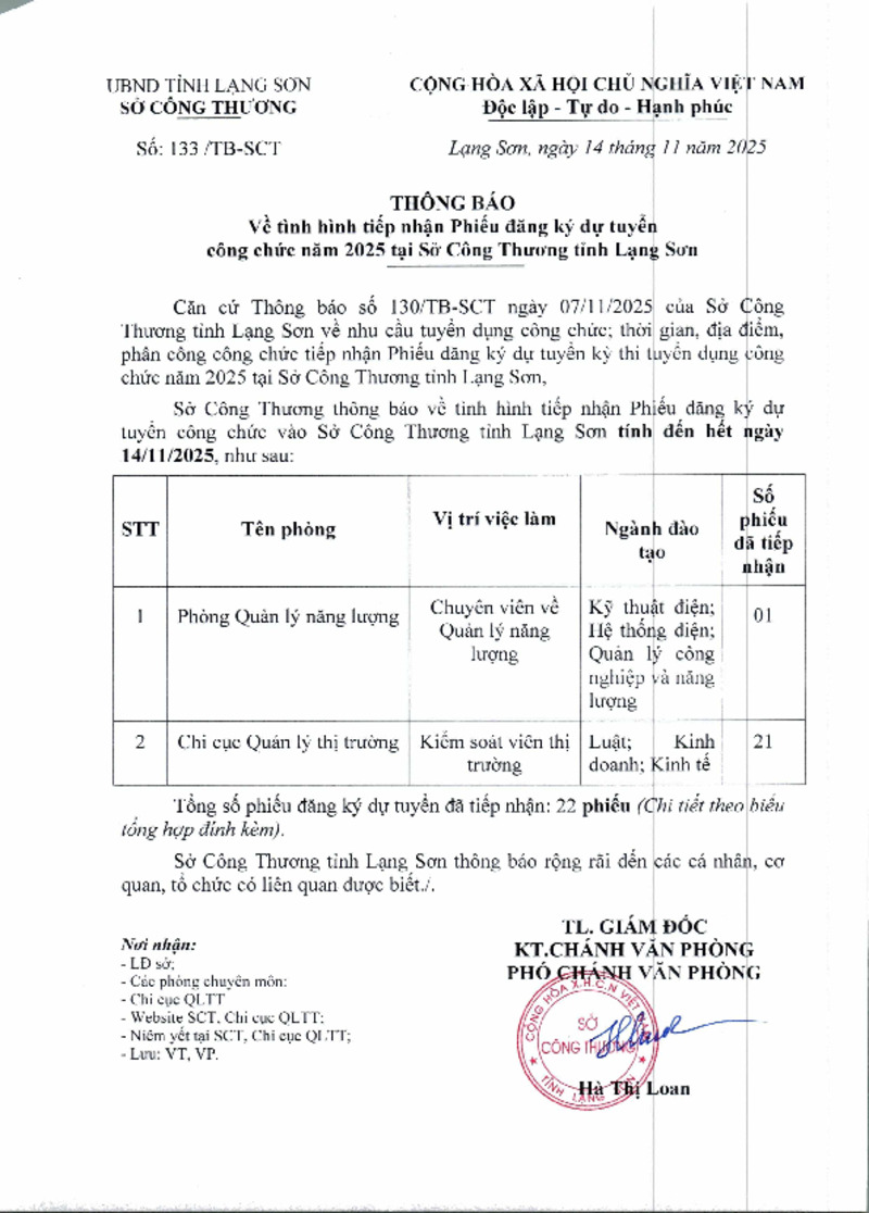 | Tiêu đề văn bản | Thông báo số 13/TB-SCT về tình hình tiếp nhận Phiếu đăng ký dự tuyển công chức năm 2025 tại Sở Công Thương tỉnh Lang Sơn | ||