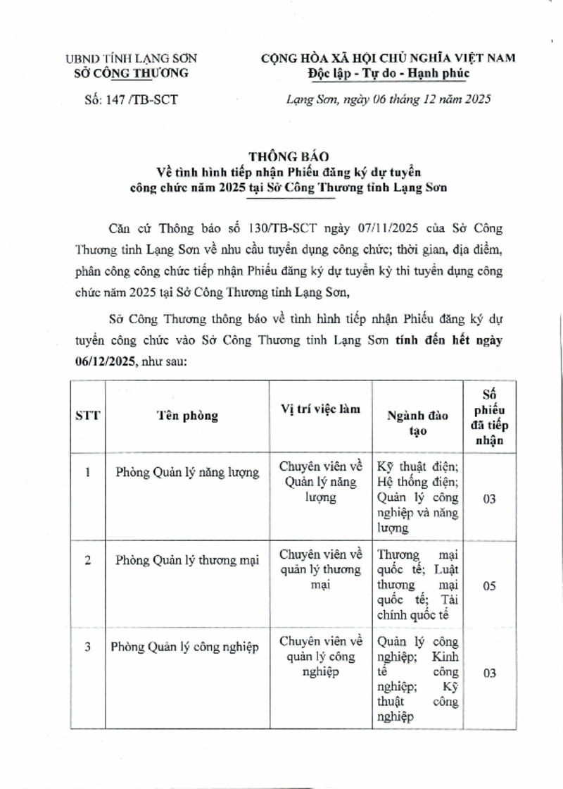 | Tiêu đề văn bản | Thông báo về tình hình tiếp nhận Phiếu đăng ký dự tuyển công chức năm 2025 tại Sở Công Thương tỉnh Lạng Sơn | ||