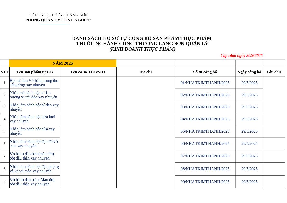 | Tiêu đề văn bản | Danh sách hồ sơ Tự công bố sản phẩm thực phẩm (lĩnh vực kinh doanh thực thực phẩm) từ tháng 5 đến ngày 18 tháng 10 năm 2025 | ||