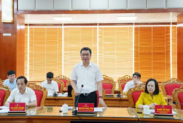 Đồng chí Nguyễn Cảnh Toàn, Phó Bí thư Tỉnh ủy, Chủ tịch UBND tỉnh trao đổi một số nội dung tại buổi làm việc