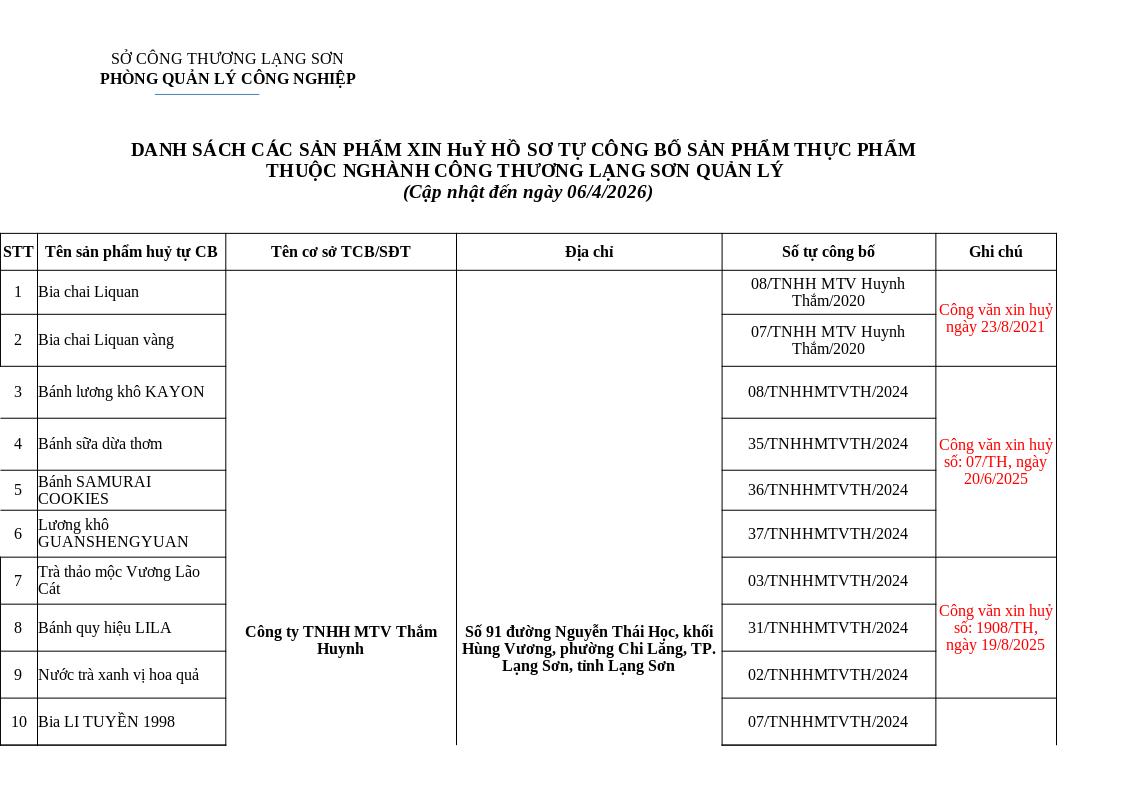 | Tiêu đề văn bản | Danh sách các sản phẩm xin huỷ hồ sơ Tự công bố (lĩnh vực kinh doanh thực phẩm) cập nhật đến ngày 06/4/2026 | ||