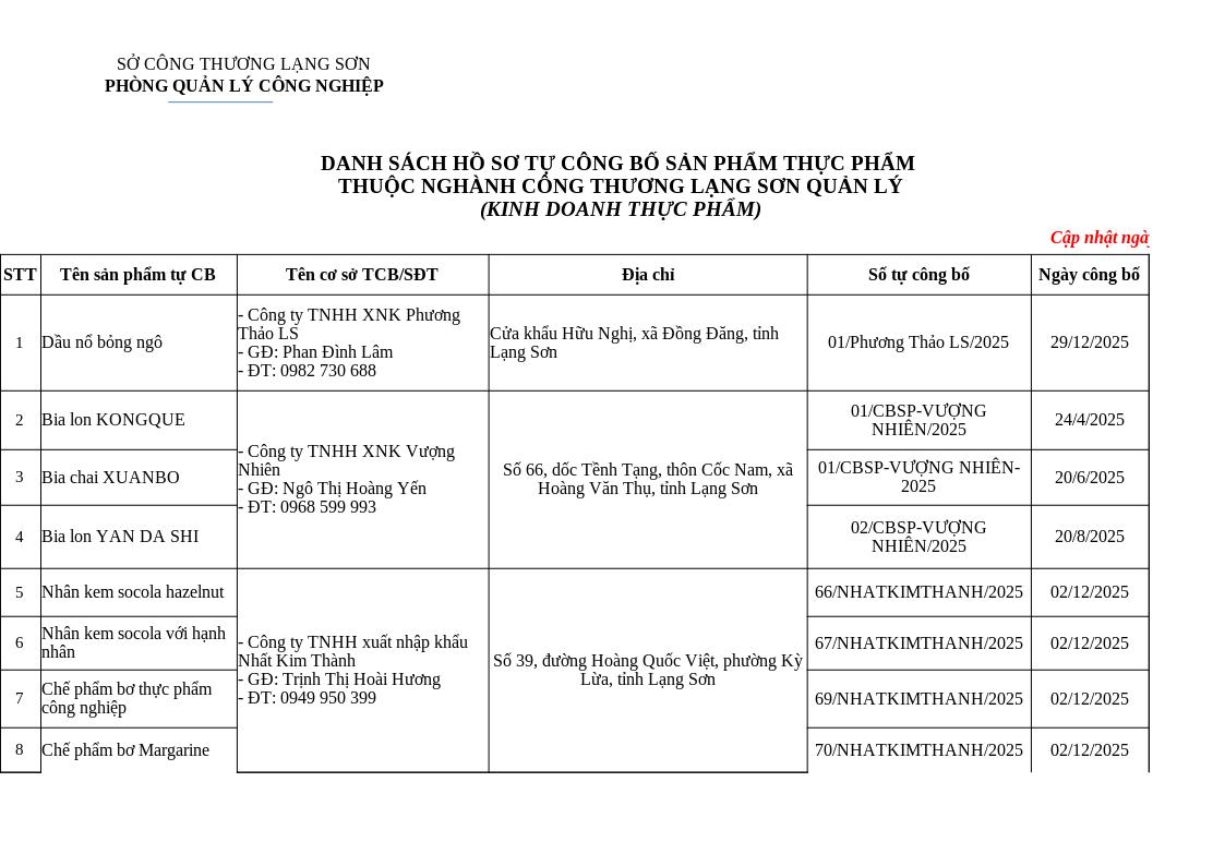 | Tiêu đề văn bản | Danh sách tự công bố sản phẩm thực phẩm (lĩnh vực kinh doanh), cập nhật nghày 08 tháng 01 năm 2026 | ||