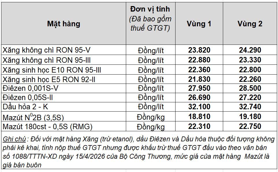 Mức giá mới có hiệu lực từ thời điểm 15 giờ 00 phút ngày 23 tháng 4 năm 2026 cho đến kỳ điều hành giá xăng dầu tiếp theo của liên Bộ Công Thương – Tài Chính; được công khai tại website petrolimex.com.vn và các Công ty xăng dầu thành viên Petrolimex.